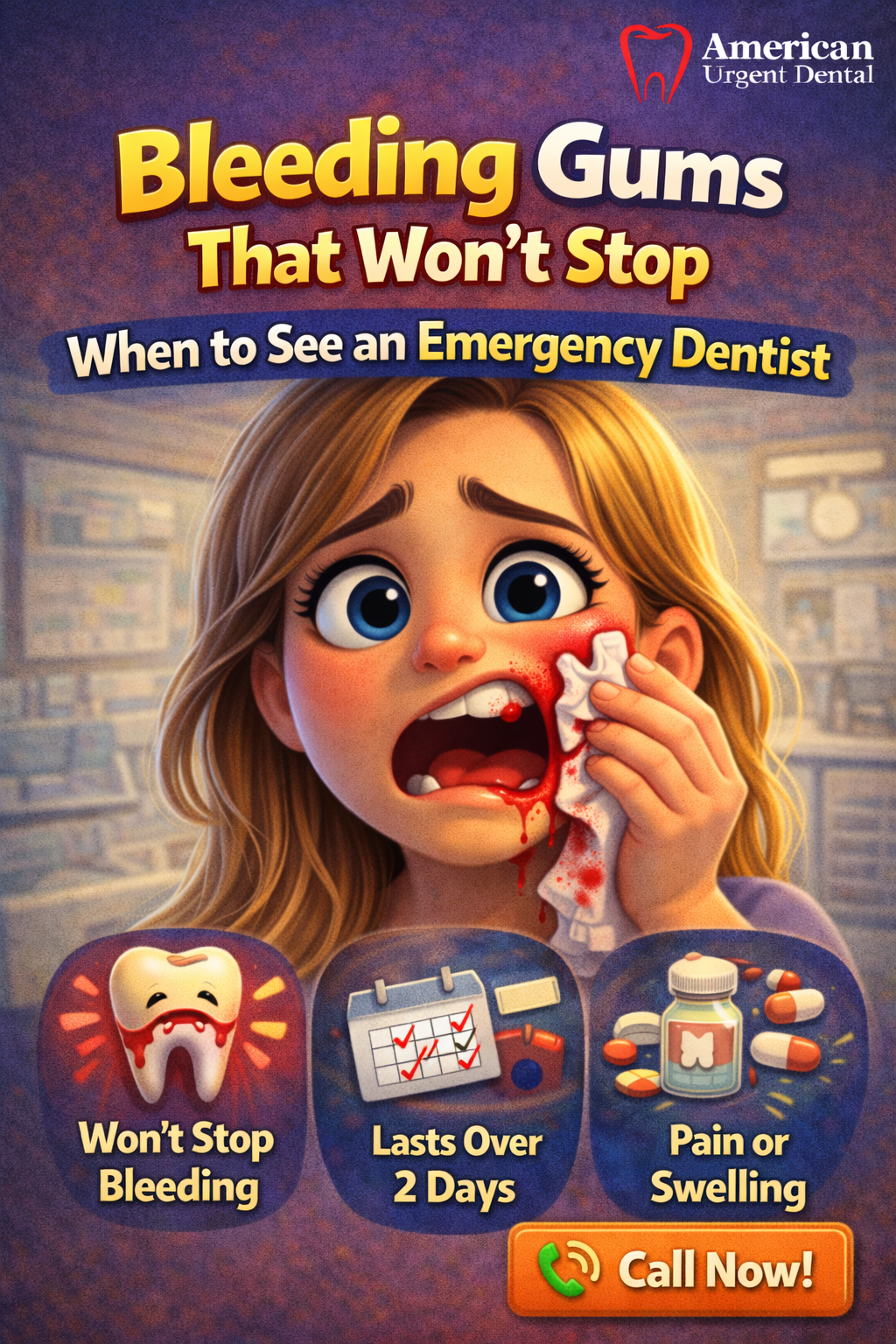 If your gums bleed regularly, even mildly, please call American Urgent Dental. We can assess whether you have gingivitis, early periodontitis, or something requiring more urgent attention.